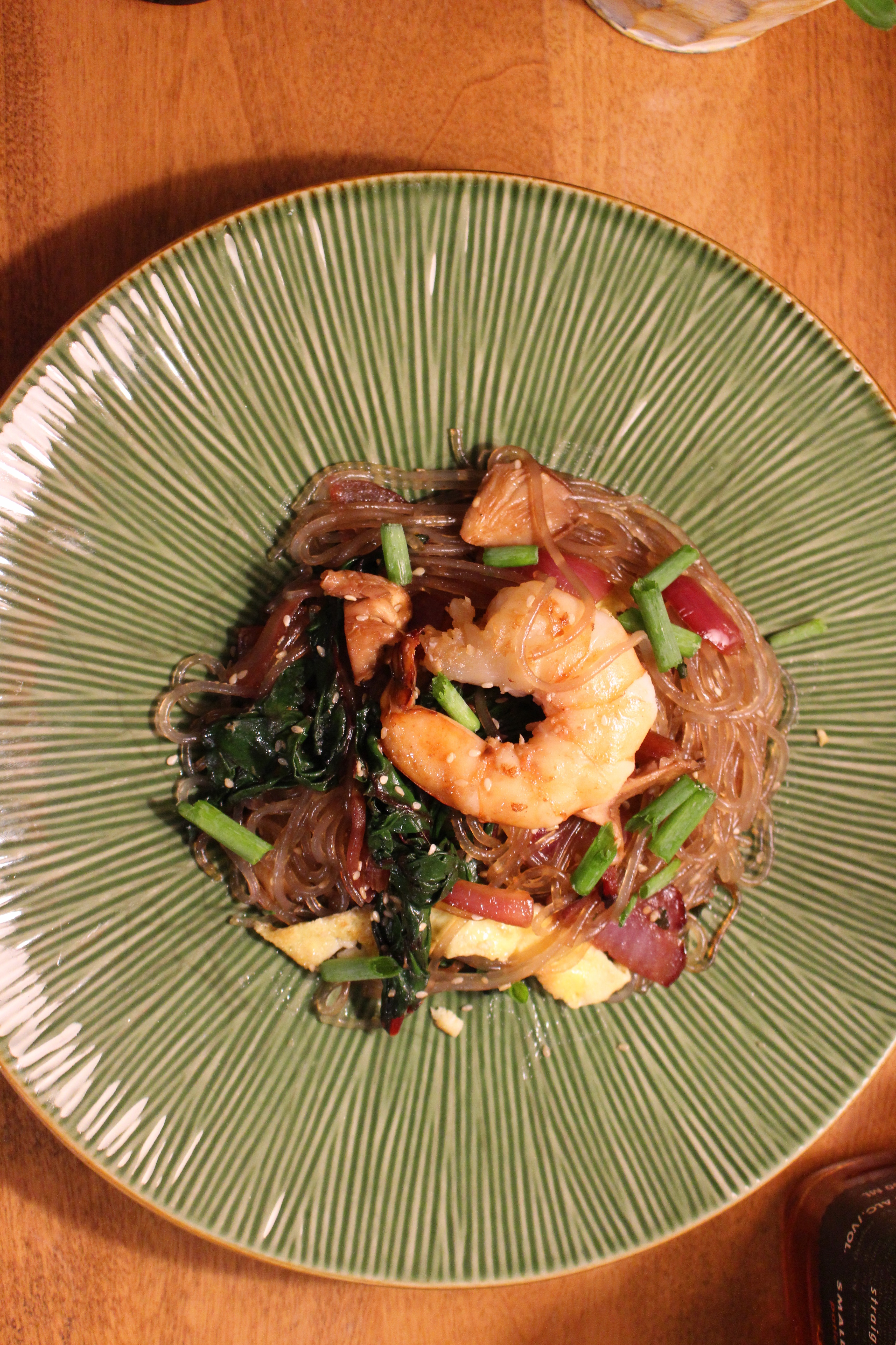 On a much grander scale, the japchae did me the same favor. Giant prawns were the star, layered on shiny sweet potato noodles with egg and onion and garlic and ginger, asparagus and red chard, and–my favorite– oyster mushrooms. Having these ingredients in my fridge prepared me for just about any stir fry I cared to dream up later in the week, and since the recipe was meant to feed 4 people, I had a steaming bowl of japchae for lunch the nest day. I am a firm believer that shrimp is NEVER as good the next day, and this was no exception, but it definitely beats a turkey sandwich or a sad salad on a weekday.