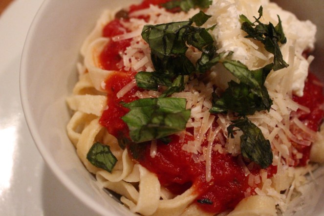The pasta turned out more outstanding than I could ever imagine. Somehow cooked to a nice al dente with only a couple of minutes in boiling water, the noodles had texture and consistency and a richness of flavor, even before being covered with sauce and cheese and fresh basil. The process took a while, but that’s the beauty of good friends. I hardly noticed.
